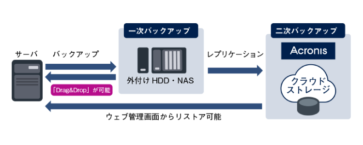 バックアップのレプリケーションを有効にすると一次バックアップ作成後すぐに二次バックアップ(Cloud)にコピー。レプリケーションされたバックアップは元のロケーションに残るバックアップには依存しません。他のロケーションにアクセスすることなく、全てのバックアップから直近のデータを短時間に復元できます。