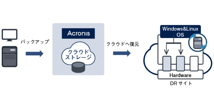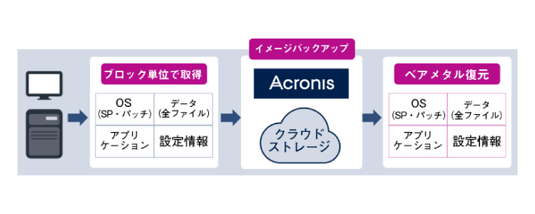 サーバやPCのディスク上 OS(サービスやパッチを含む)、アプリケーション、設定情報、データ(全ファイル)を丸ごとバックアップし、そのまま異なるハードウェア・クラウド環境へ丸ごと復元。ブロック単位でバックアップするため、ファイル数に依存することなく高速にバックアップ・復元ができます。