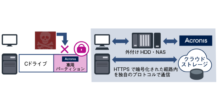 PCやファイルサーバの内部/外部ディスク上にAcronis Backupのエージェンシーからのみアクセス可能な隠しパーテーションを作成。ランサムウェアからバックアップデータを保護します。また、オプションでクラウドストレージへのアクセスに独自のプロトコルを用い、バックアップ領域を端末から直接参照しないため、被害を完全に防止することができます。