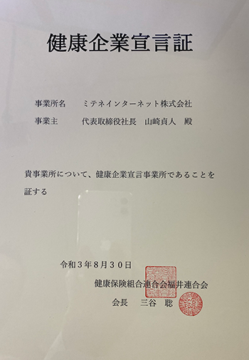 ニュース 2021.09.02 「健康企業宣言証」を三谷健保組合より受理いたしました。 この度、三谷健保組合より「企業宣言証」を受理いたしました。 これからも従業員が健康に働くことができる職場づくりに積極的に取り組んでまいります。三谷健保組合サイトへ 一覧に戻る