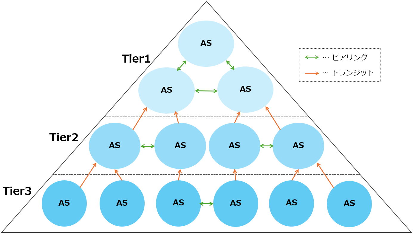 インターネットを管理しているISP(インターネットサービスプロバイダ)ですが、規模に応じて「Tier(ティア)」という階層に分類されます。一番上のTier1は、インターネット上のすべての通信経路(フルルート)を保有する、世界でごく一部の限られたプロバイダだけが属します。続くTeir2、Tier3とどんどん規模が小さくなり、下位のISPは上位のISPから通信経路を共有してもらうことで、自社のユーザーにインターネット接続サービスを提供しています。
